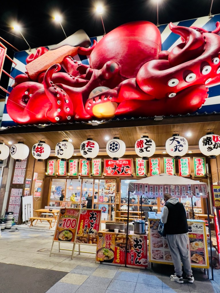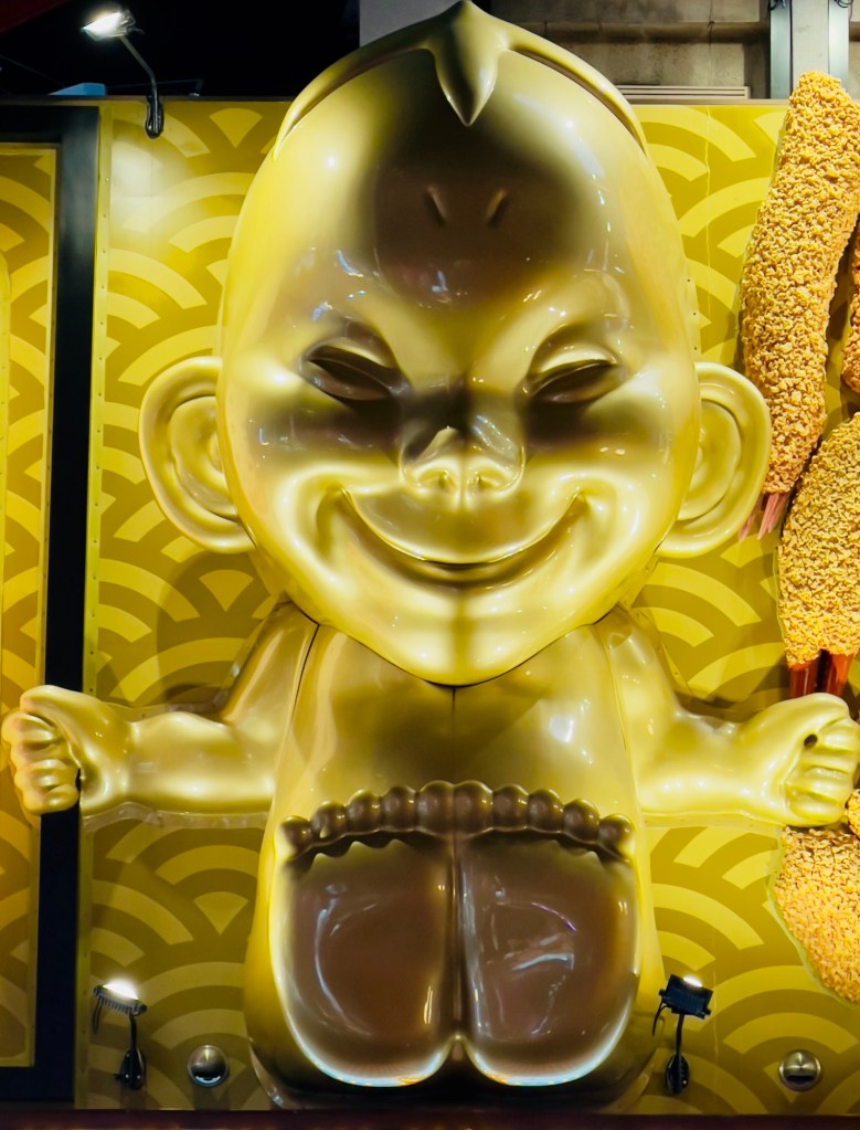 Then, something caught my eye: a peculiar but undeniably charming golden statue . I had no idea who he was, but he was there, quietly watching over the street. Intrigued, I looked it up and learned that the statue is of Billiken, a figure deeply rooted in Osaka’s culture and history. His Buddha-like smile, pointed ears, and elongated head made him appear quirky yet endearing. More than just a funny statue, he’s a symbol of good fortune, embodying the city’s spirit of welcoming warmth and happiness. I couldn’t help but think how his joyful smile seemed to echo the happiness I saw in the faces of the people around me, those who had come to enjoy the simple pleasures that Osaka offers so generously.