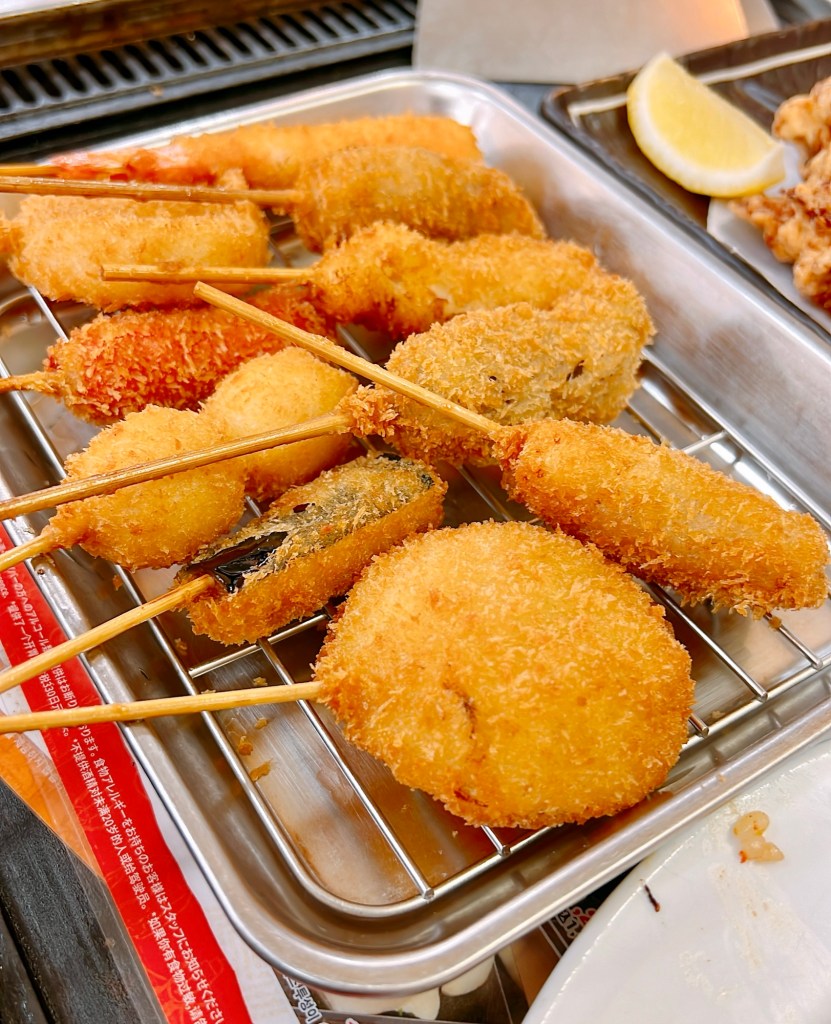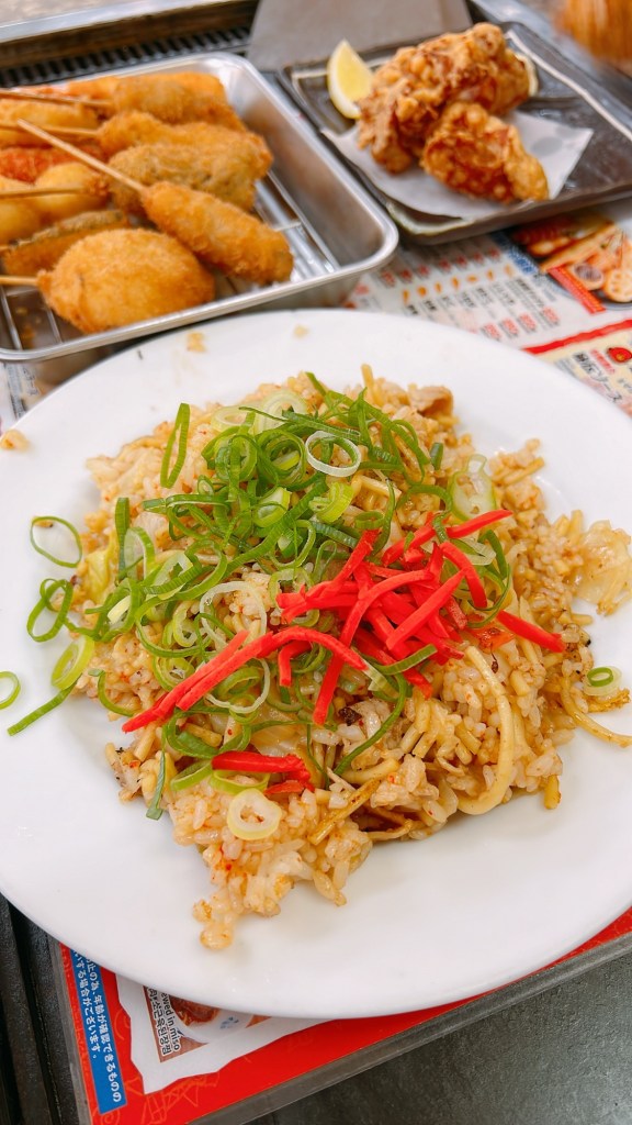 But there was one thing I was especially excited about: food. I had heard so much about the delicious offerings in Shinsekai, and now I was ready to dive in. The hardest part? Deciding where to eat. Everywhere I looked, there were tempting options. After wandering for a while, I finally stumbled upon a place that seemed just right. The menu was packed with mouthwatering dishes, and I found myself debating for way longer than I thought I would. In the end, though, there was one thing I had to try: the locals’ favorite, kushikatsu. How could I not? But I wasn’t stopping there. I was a little hungry, so I also added some karaage(fried chicken) and yaki meshi (fried rice) to my order.